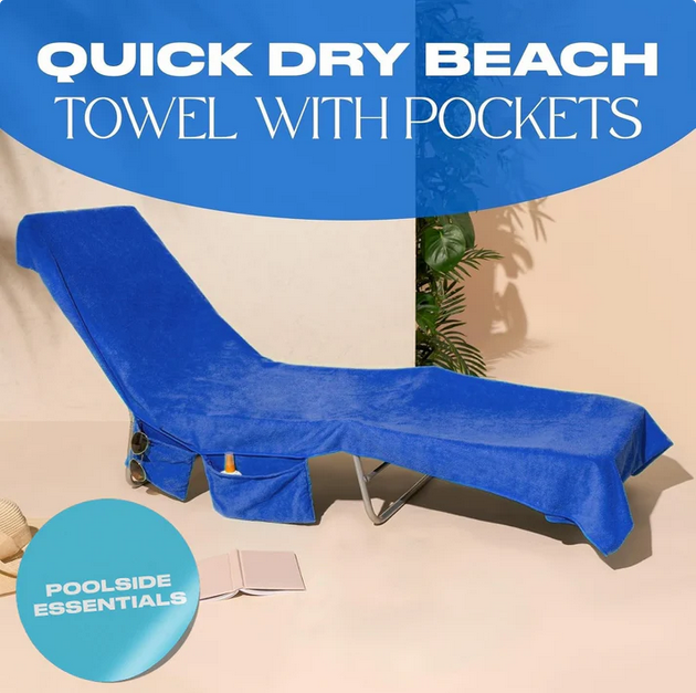 A towel (Size 29* 83 inches) with the a pocket sewn in the top that can be easily cover on the lounge chair/recliner and the towel will stay put, so there is no need to worry about the wind blowing off the towel. no more slipping towels from the top!! They are also easily visible from a distance and will not lose your position when pool attendants or others walk around.